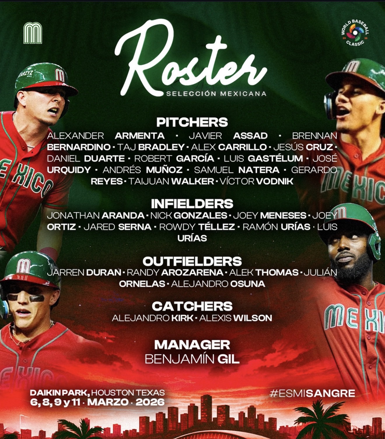 Bajo la dirección del manager Benjamín Gil, México contará con un plantel equilibrado que combina experiencia en Grandes Ligas, talento joven y profundidad en todas las áreas del campo, con el objetivo de volver a ser protagonista en el escenario internacional.